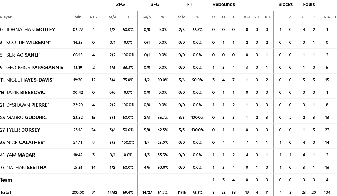 Καταπληκτικός ο Ντόρσεϊ με 24 πόντους και 3/3 τρίποντα, με τον Γκούντουριτς να έχει 15 πόντους με 3/3 τρίποντα και τον Σέστινα 14 πόντους και 4/5 τρίποντα, με την Φενέρ να τελειώνει το ματς με 14/27 από τα 6.75.