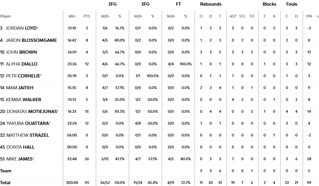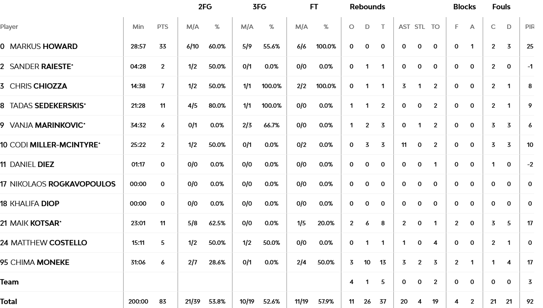 26 πόντους και επτά ασίστ είχε ο καταπληκτικός Μάικ Τζέιμς, με τον Μοτεγιούνας να έχει 13 πόντους, ενώ για την Μπασκόνια, ο Χάουαρντ είχε 33 πόντους και οι Σεντεκέρσκις και Κότσαρ από 11 έκαστος.