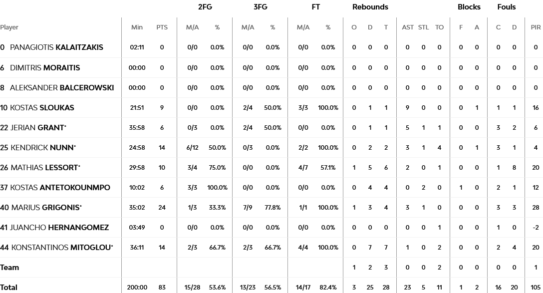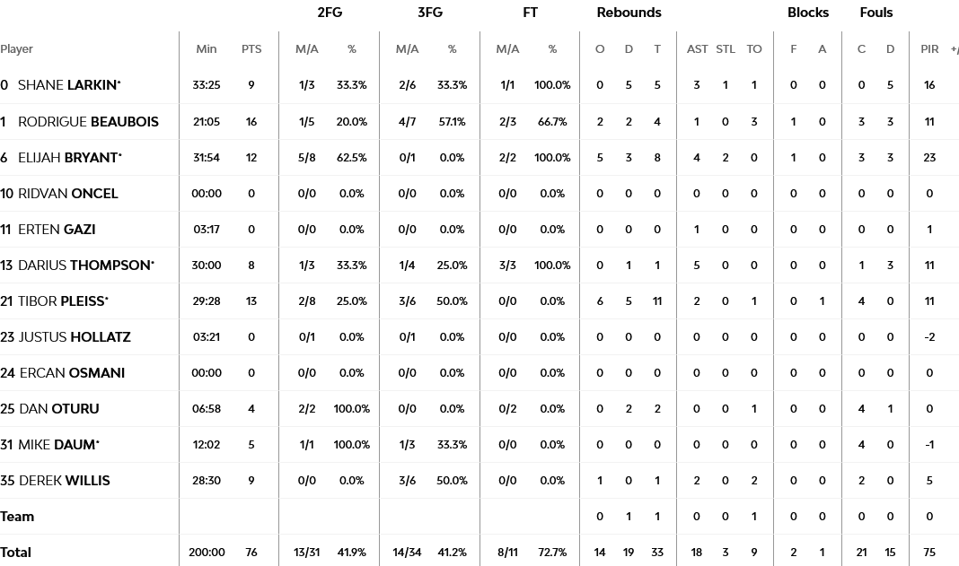 Ξεχώρισαν: Από 14 πόντους είχαν Ναν και Μήτογλου, ενώ ο Σλούκας είχε εννιά πόντους και ισάριθμες ασίστ. Για την Εφές, 16 πόντους είχε ο Μπομπουά, που πήγε να γυρίσει μόνος του το παιχνίδι, με τον Πλάις να έχει 13 πόντους και 11 ριμπάουντ.