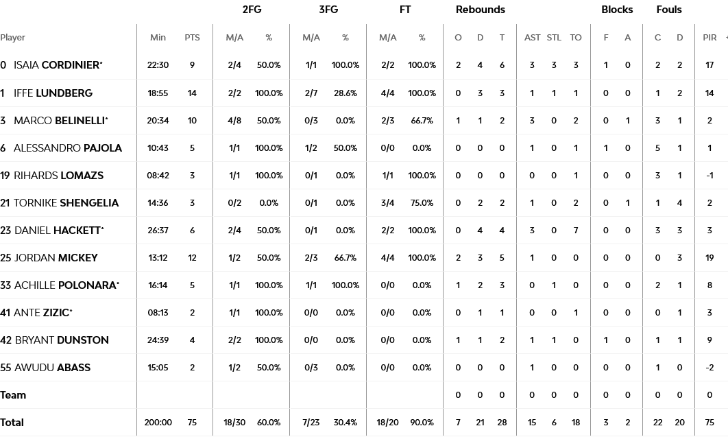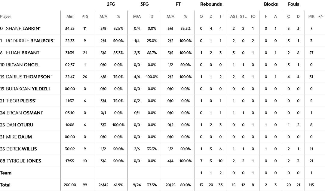 Εκπληκτική εμφάνιση από τον Ντάριους Τόμπσον με 26 πόντους και πέντε κλεψίματα, με τον Μπράιαντ να έχει 21 πόντους. Για την Βίρτους, ο Λούντμπεργκ είχε 14 πόντους.