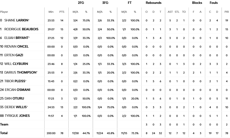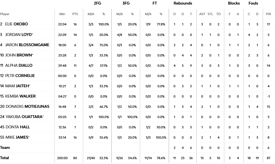 Τζέιμς και Οκόμπο σημείωσαν από 16 πόντους έκαστος, με τον Λόιντ να προσθέτει 14, ενώ ο Ντιαλό είχε 11 πόντους και εννέα ριμπάουντ. Για την Εφές, Μπομπουά και Λάρκιν είχαν 15 και 14 πόντους αντίστοιχα, ο Γουίλις 13 και ο Μπράιαντ 12 πόντους.