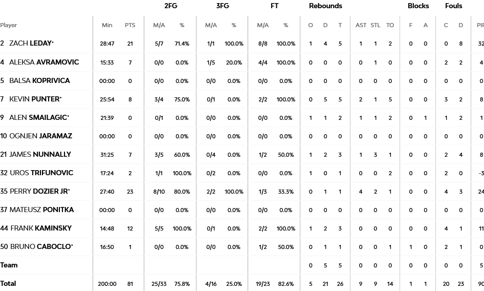 Για τους Σέρβους ο Ντοζίερ ξεχώρισε έχοντας 23 πόντους , ενώ ο Λέντει ακολούθησε με 21. Από την άλλη ηγετική εμφάνιση έκανε ο Έβανς με 25 πόντους αλλά ήταν κυριολεκτικά μόνος .