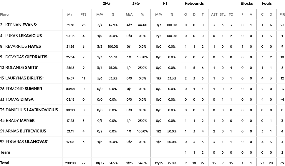 Δυνατά μπήκε στο παιχνίδι η Ζαλγκίρις η οποία με τα τρίποντα του Έβανς και την ευστοχία του Μπίρουιτς προηγήθηκε στην αρχή του παιχνιδιού με σκορ 15-4, ο Ντοζίερ μόνος του γύρισε το παιχνίδι και μείωσε στους τέσσερις (13-17) με τους Λιθουανούς να διατηρούν το προβάδισμα τους μέχρι το τέλος της περιόδου ( 22-26). Στην δεύτερη περίοδο , οι Λιθουανοί με δυο καλάθια του Έβανς και του Χέιζ έκαναν το σκορ σε 30-22. Οι Λέντει και Νάναλι μείωσαν το χάντικαπ και προσπέρασαν στο σκορ στο τέλος του ημιχρόνου (45-43).