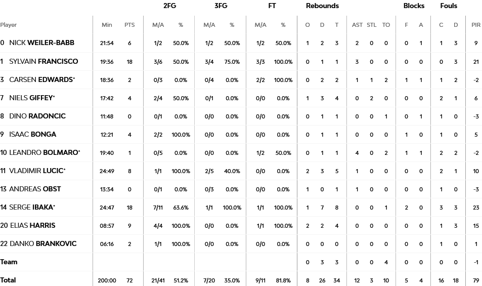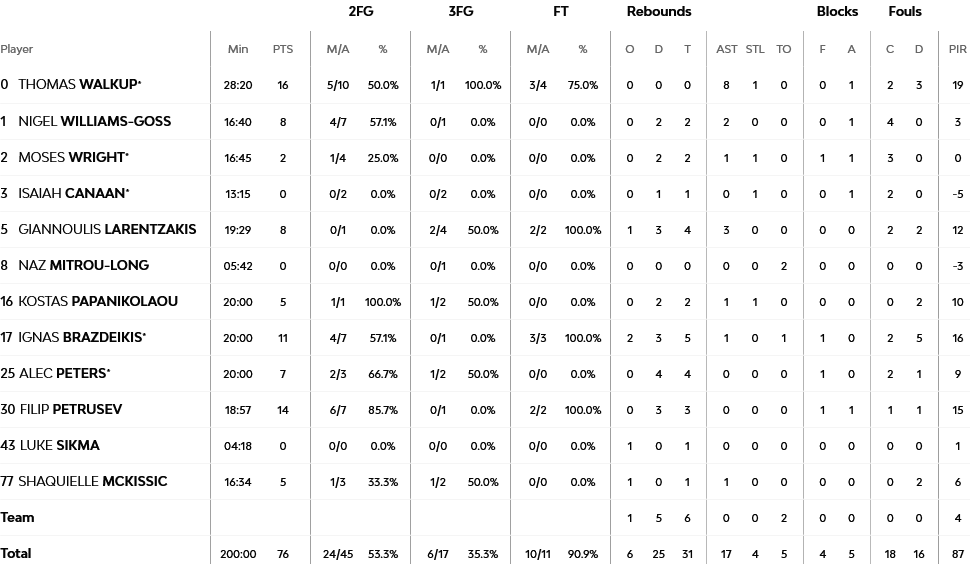Ξεχώρισαν: Σπουδαία εμφάνιση ο Πετρούσεβ με 14 πόντους, ακόμα ένα πολύ καλό παιχνίδι από τον Μπραζντέικις με 11 πόντους και πέντε ριμπάουντ. Από πλευράς Μπάγερν… όλα τα λεφτά ήταν ο Ιμπάκα με 18 πόντους και οκτώ ριμπάουντ και ο Φρανσίσκο με 18 πόντους.