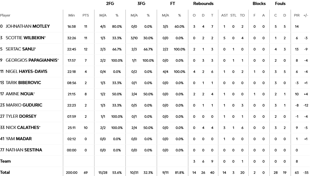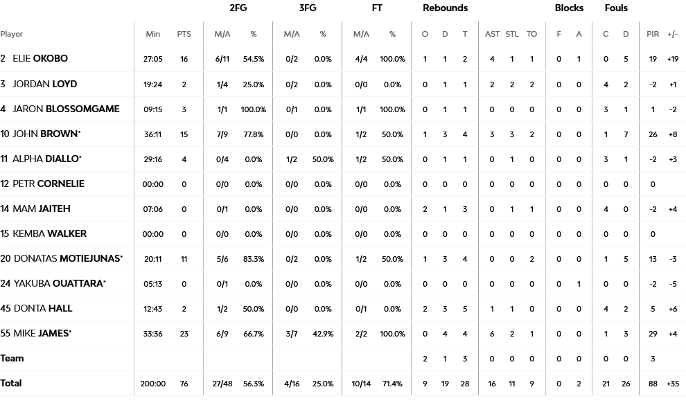 Για τους νικητές Μάικ Τζέιμς με 23 πόντους και Έλι Οκόμπο με 16, ήταν οι μεγάλοι πρωταγωνιστ΄ες. Όσον αφορά την Φεν΄έρ, ο Σανλί πέτυχε 12 πόντους και ο Γουίλμπεκιν 11.