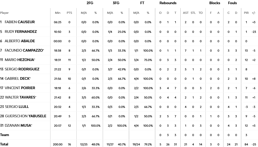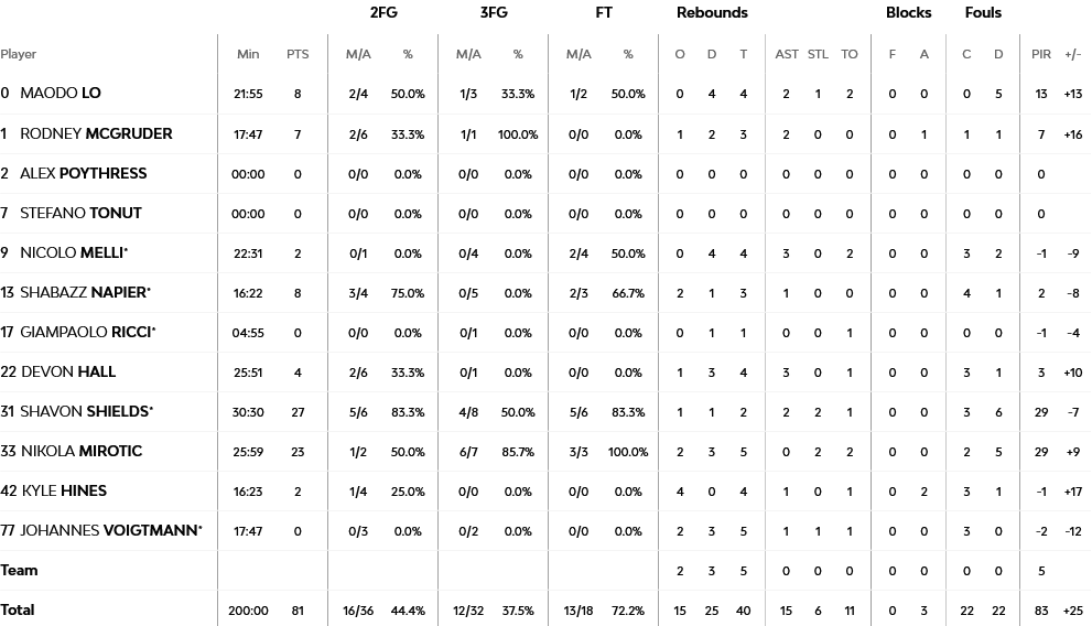 Σπουδαία εμφάνιση για τους Ιταλούς έκανε ο Σιλντς με 27 πόντους και ακολούθησε ο Μίροτιτς με 23. Αντίθετα για την ομάδα της Μαδρίτης πρώτος σκόρερ αναδείχθηκε ο Μούσα με 12 πόντους.