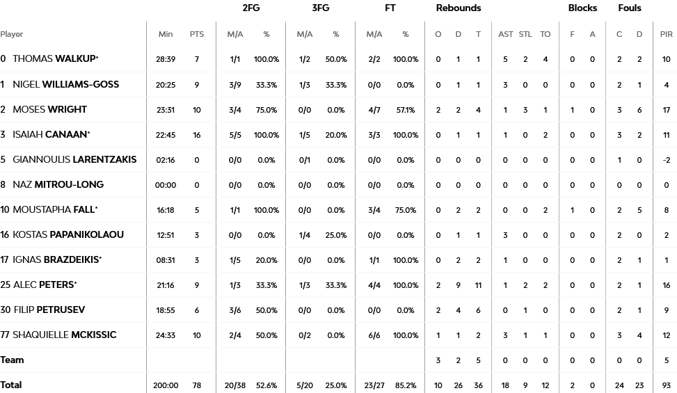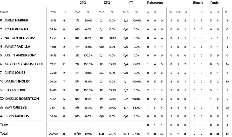 Ξεχώρισαν: Από 10 πόντους είχαν ΜακΚίσικ και Ράιτ, ενώ ο Πίτερς τελείωσε το ματς με εννέα πόντους αλλά και 11 ριμπάουντ. Για την Μπασκόνια, 19 πόντους είχε ο Οτζελέγε και 10 ο Λόπεθ Αροστέγκι.