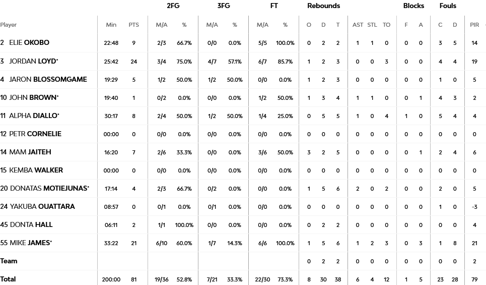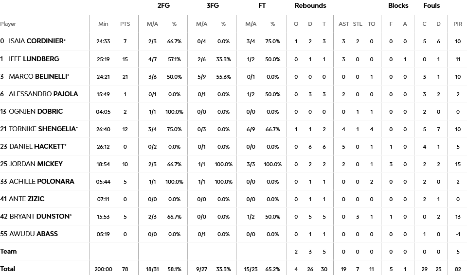 Καταπληκτικό παιχνίδι από Λόιντ και Τζέιμς, με 24 και 21 πόντους αντίστοιχα, ενώ για την Βίρτους, ο Μπελινέλι είχε 21 πόντους και ο Λούντμπεργκ 15, με τον Δανό, όμως, να αστοχεί τρεις φορές στο τελευταίο λεπτό, στο σουτ που θα έδινε την νίκη στην ομάδα του.