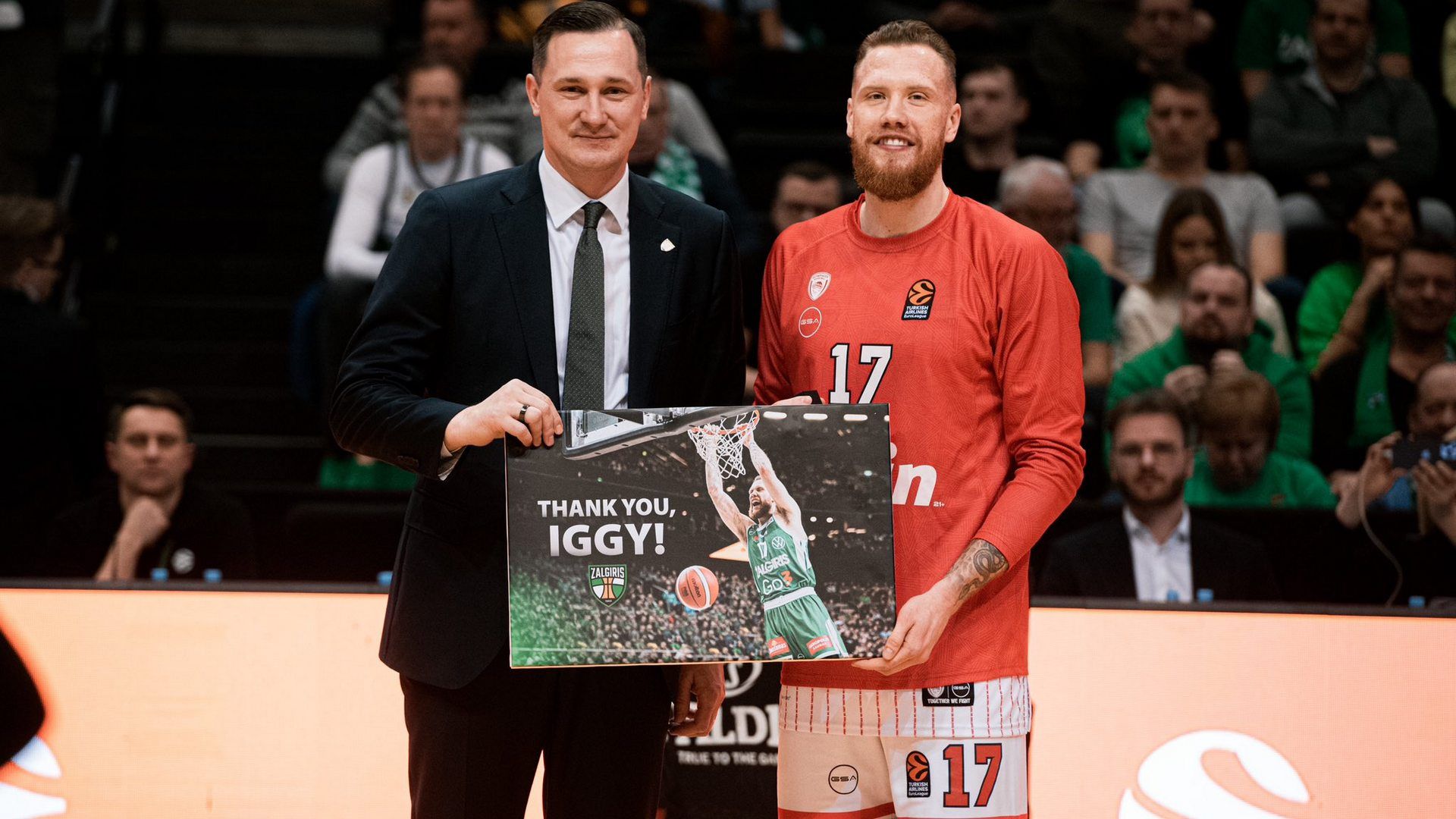 Πριν την έναρξη του παιχνιδιού του Ολυμπιακού με την Ζάλγκιρις , ο Λιθουανικός σύλλογος βράβευσε τον 25χρονο Λιθουανό φόργουορντ για το πέρασμά του από τον σύλλογο, προσφέροντάς του έναν πίνακα που πάνω έγραφε «Thank you Iggy».