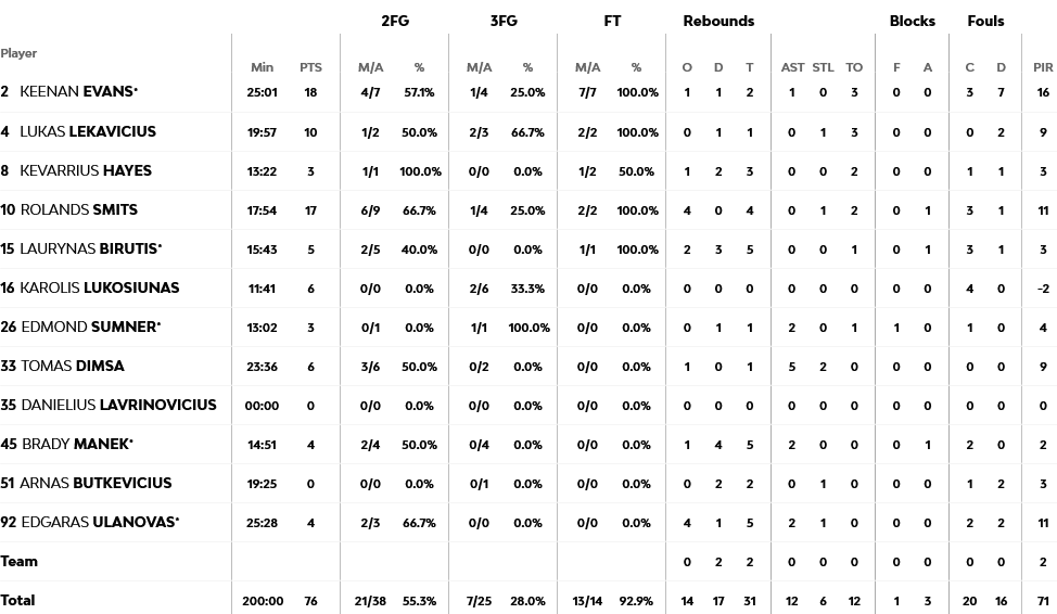 Ξεχώρισαν: Σαρωτική εμφάνιση από τον Σακίλ ΜακΚίσικ με 20 πόντους, στους 16 σταμάτησε ο Πίτερς, ενώ ο Ράιτ με 11 πόντους… κατάπιε την front line της Ζαλγκίρις. Για τους γηπεδούχους, ο Έβανς είχε 18 πόντους και ο Σμιτς 17.