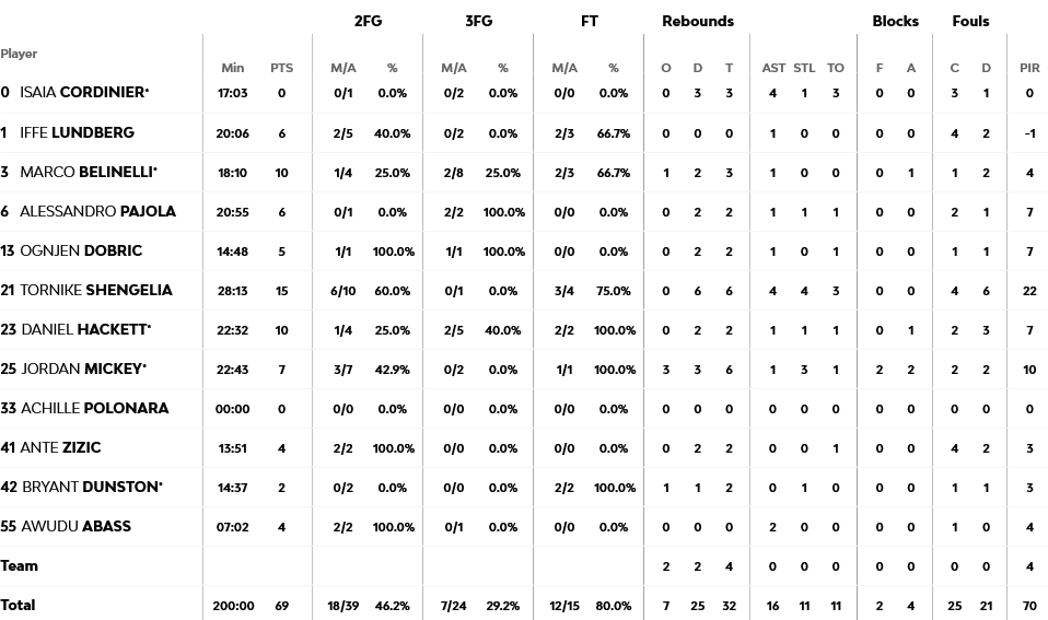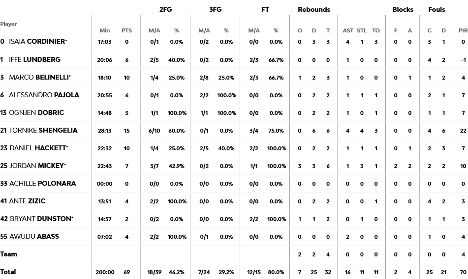 Ξεχώρισαν: 12 πόντους σημείωσε ο Κάνααν και 11 ο Φαλ, ενώ για την Βίρτους, ο Σενγκέλια είχε 15 πόντους, έξι ριμπάουντ, τέσσερις ασίστ και ισάριθμα κλεψίματα.