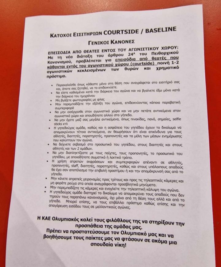 Ο Ολυμπιακός υποδέχεται τον Παναθηναϊκό, για την 29η αγωνιστική της Euroleague και οι «ερυθρόλευκοι», με ανακοίνωση τους, προειδοποιούν τους κατόχους εισιτηρίων σε θέσεις γύρω από το παρκέ, για τις κυρώσεις που θα έχει η ομάδα, σε περίπτωση επεισοδίων.