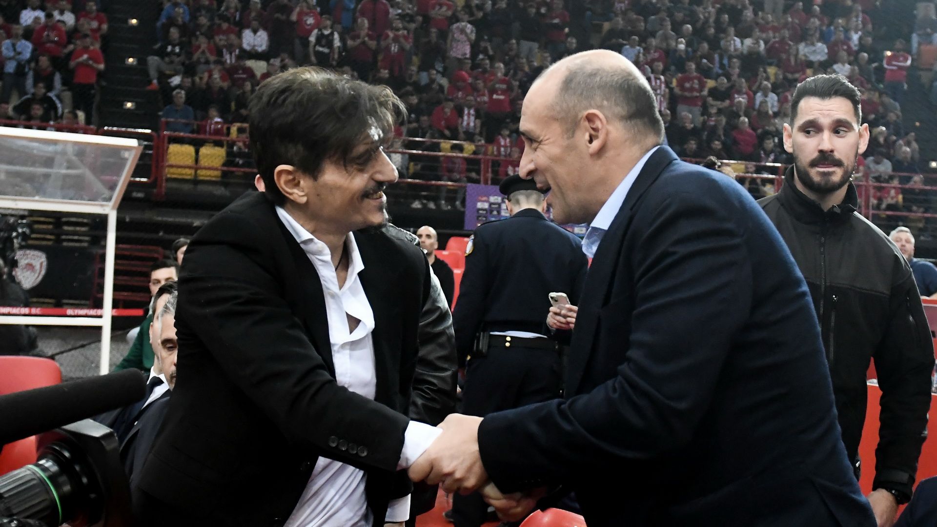 Οι διοικητικοί ηγέτες του Ολυμπιακού είχαν τετ α τετ πριν από την έναρξη του αγώνα, με τον ιδιοκτήτη της ΚΑΕ Παναθηναϊκός, με τους τρεις άνδρες να προχωρούν σε χειραψία.