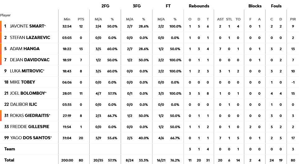 Από τους νικητές ξεχώρισε ο Μπόνζι Κόλσον με 23 πόντους, ενώ από την άλλη για τους ηττημένους διακρίθηκε ο Γιάγκο Ντος Σάντος με 20.