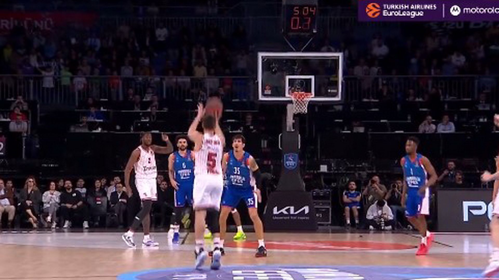 Το ρολόι έδειχνε 5.01 πριν το φινάλε της δεύτερης περιόδου, με το σκορ στο 35-27 και την μπάλα να καταλήγει στον Γιαννούλη Λαρεντζάκη, το χρονόμετρο της επίθεσης του Ολυμπιακού να μηδενίζει και τον «Λάρυ» να σηκώνεται από το… logo και να εκτελεί για το 35-30.
