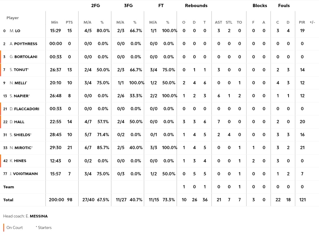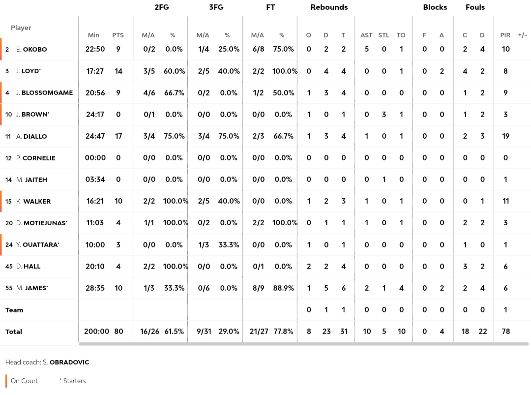 Πρώτος σκόρερ για τους νικητές ο Νίκολα Μίροτιτς με 21 πόντους,ενώ ο Λο είχε 15. Για τους γηπεδούχους,ο Ντιαλό είχε 17 και ο Λόιντ 14.