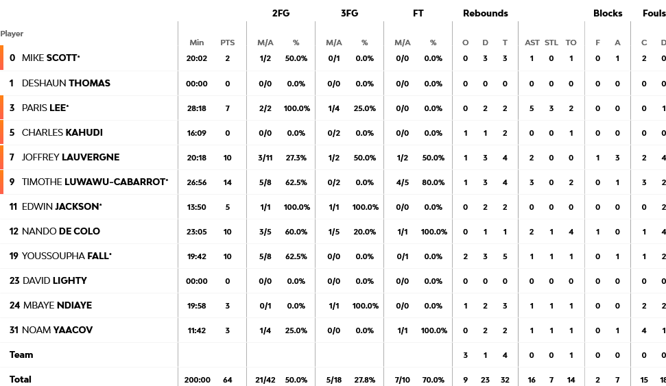 Ξεχώρισαν: Απολαυστικός ο Φαλ με 12 πόντους, έξι ριμπάουντ, τέσσερις ασίστ και ισάριθμες τάπες. Για την Βιλερμπάν, 14 πόντους είχε ο Λουβαβού Καμπαρό και από 10 οι Ντε Κολό, Φαλ και Λοβέρν.