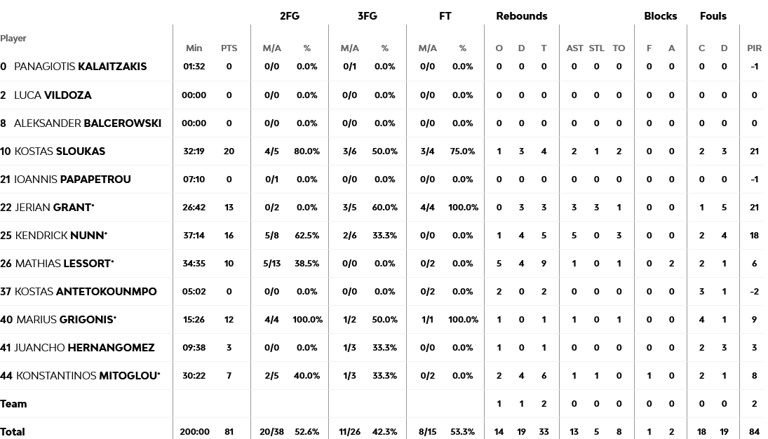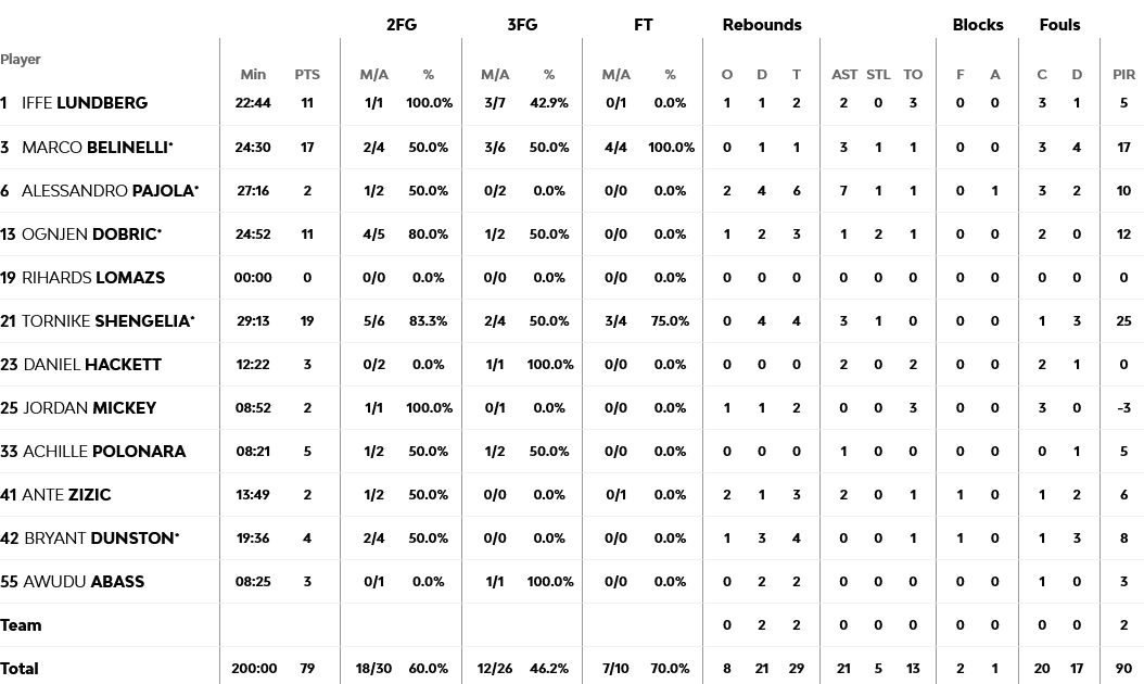 Ξεχώρισαν: Εξαιρετικός ο Σλούκας με 20 πόντους, με τον Γκραντ να έχει 13 (όλους στην πρώτη περίοδο), τον Γκριγκόνις 12 και τον Λεσόρ 10 πόντους. Για την Βίρτους, που επέστρεψε από το -17, όμως είδε τον Ναν να την… εκτελεί στο φινάλε, ο Σενγκέλια είχε 19 πόντους και ο Μπελινέλι 17.