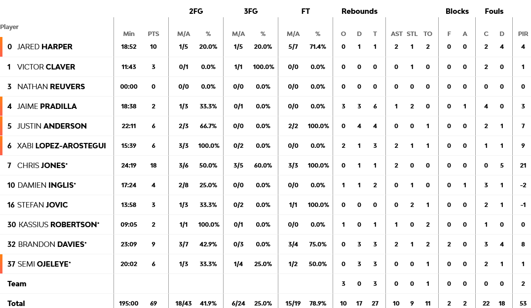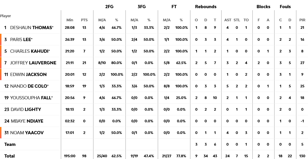 Πέντε παίκτες της Βιλερμπάν (από τους 10 που είχαν συνολικά διαθέσιμους για την αναμέτρηση) τελείωσαν το παιχνίδι με διψήφιο αριθμό πόντων, με τον Λοβέρν να έχει 21, τον Ντε Κολό 19, ενώ από το… ναυάγιο της Βαλένθια, Τζόουνς και Χάρπερ είχαν 18 και 10 πόντους αντίστοιχα.