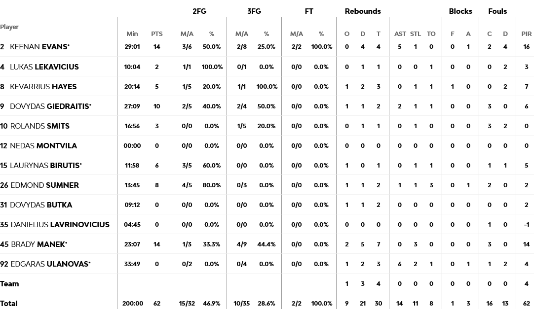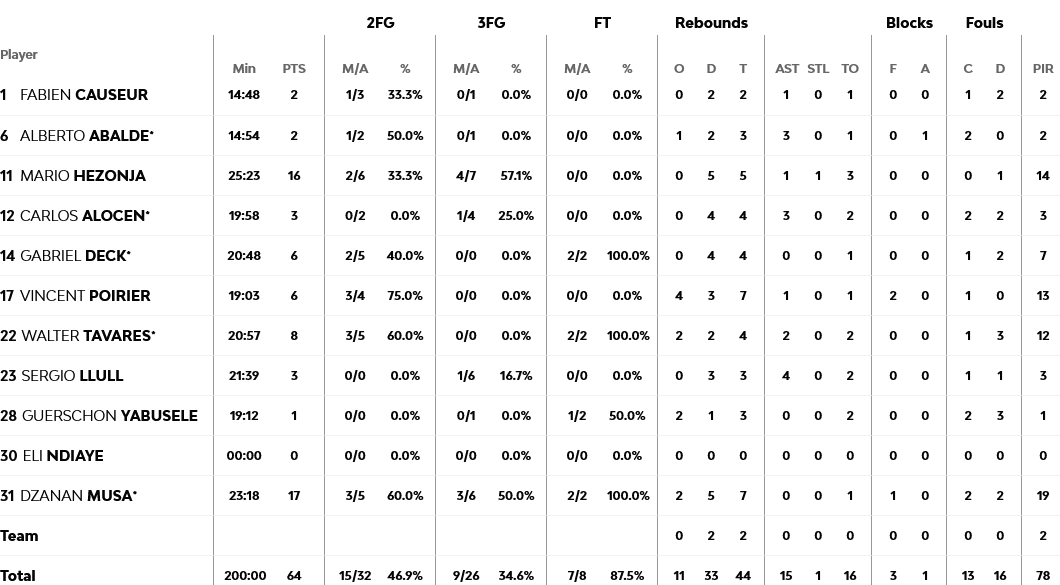 Ο Μούσα με 17 πόντους και επτά ριμπάουντ, ήταν ο κορυφαίος για την Ρεάλ, με τον Χεζόνια να τελειώνει το ματς με 16 πόντους. Για την Ζαλγκίρις, Μάνεκ και Έβανς είχαν από 14 πόντους έκαστος.