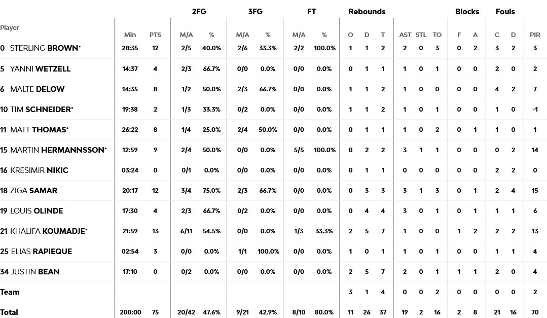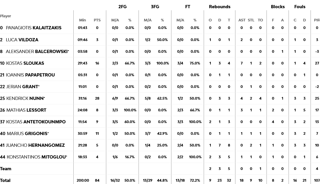 Ξεχώρισαν: Εξαιρετικός ο Σλούκας με 16 πόντους, τέσσερα ριμπάουντ και επτά ασίστ, ενώ ο Γκριγκόνις είχε 11 πόντους. Για την Άλμπα, 13 πόντους είχε ο Κουμάτζε και από 12 οι Σαμάρ και Μπράουν.