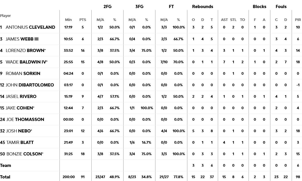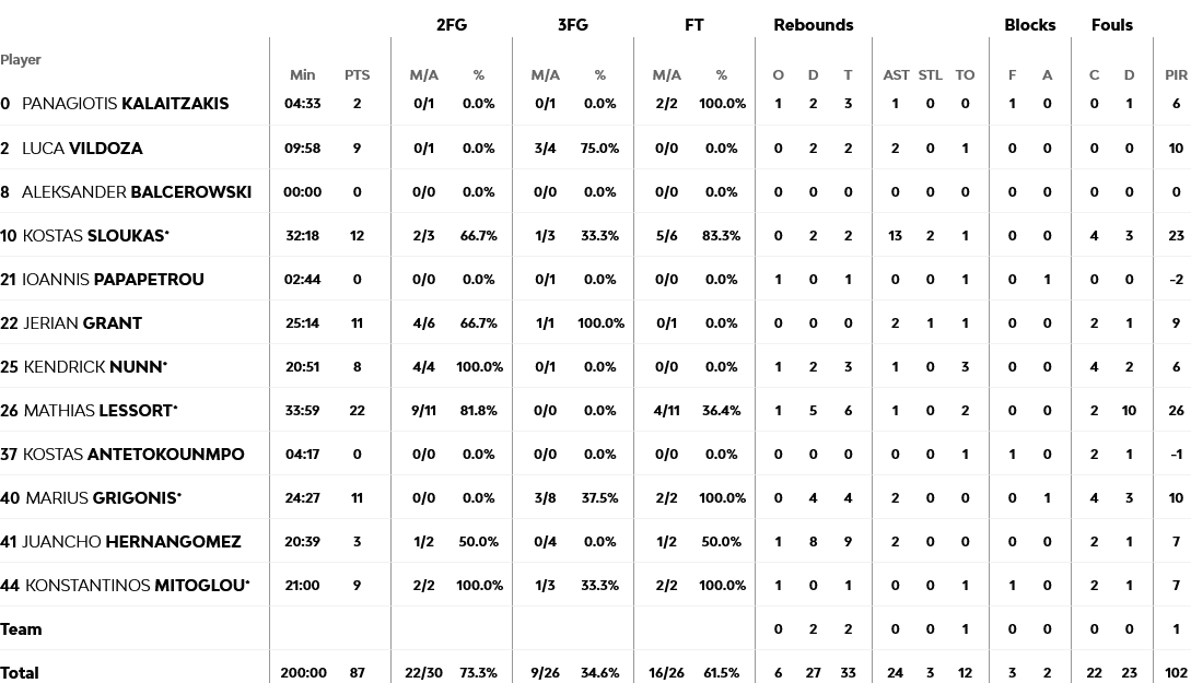 Ξεχώρισαν: 16 πόντους σημείωσε ο Μπράουν, με τον Μπόλντγουιν να έχει 15 πόντους και επτά ασίστ, αποχωρώντας, όμως, με τραυματισμό στα μισά της τέταρτης περιόδου. Για τον Παναθηναϊκό, 22 πόντους είχε ο Λεσόρ, με τον Σλούκα να έχει 12 πόντους και 13 ασίστ.