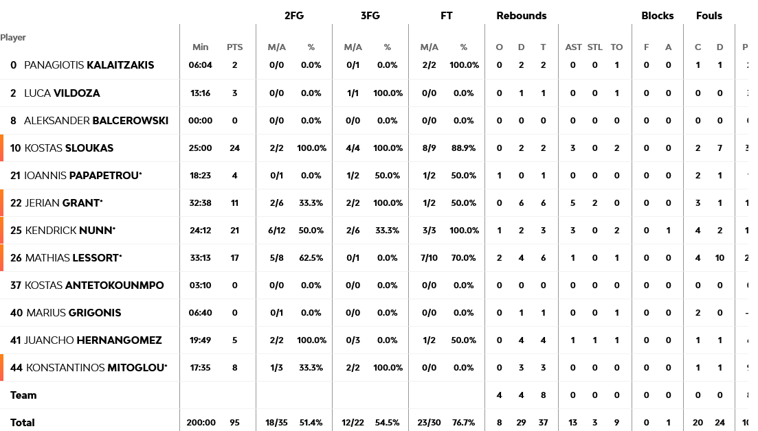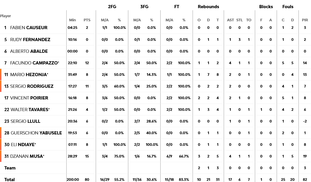 Ξεχώρισαν: Σπουδαία εμφάνιση από τον Λεσόρ με 17 πόντους, ενώ ο Ναν ήταν ο κλασσικός… φονιάς με 21 πόντους. Για την Ρεάλ, που μετά το εκρηκτικό πρώτο δεκάλεπτο, παγιδεύτηκε στις… δαγκάνες των «πράσινων», ο Μούσα είχε 15 πόντους και ο Καμπάτσο 12.