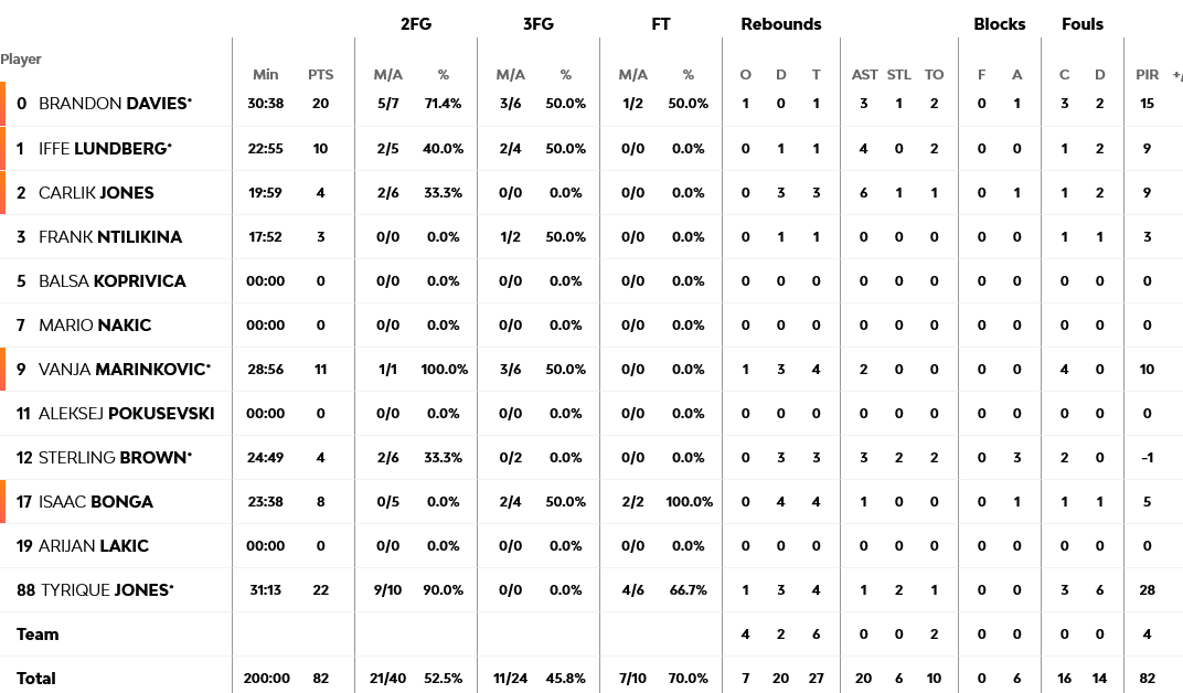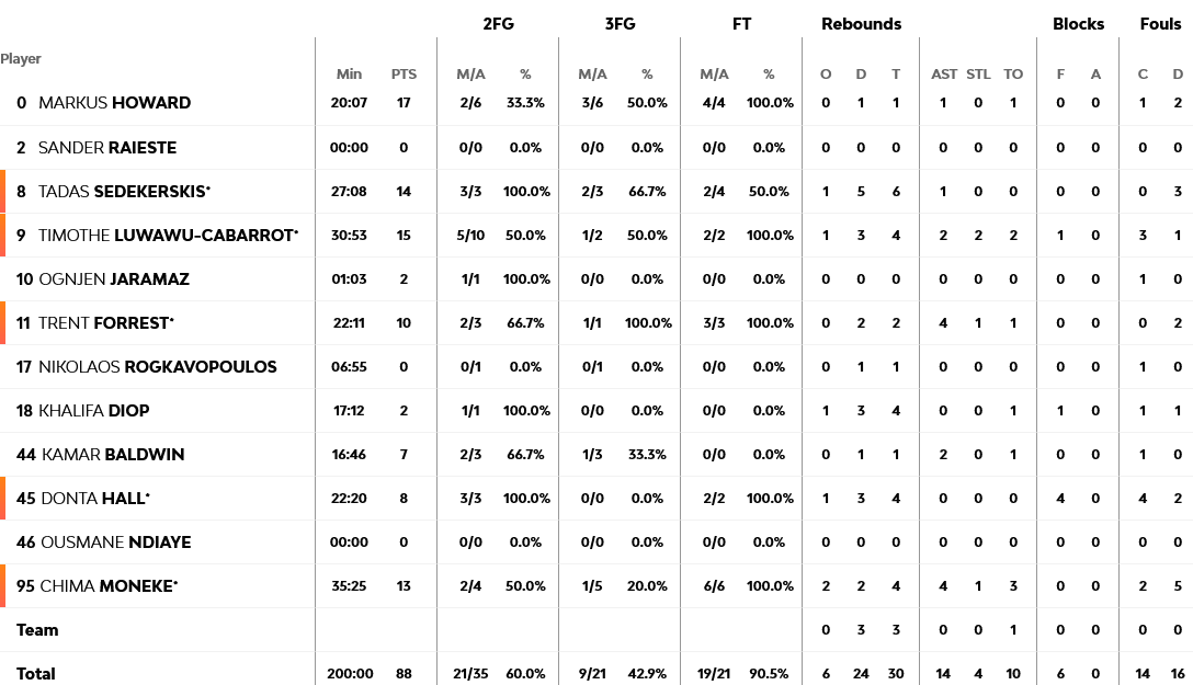 Οι Βάσκοι τελείωσαν το ματς με πέντε διψήφιους παίκτες, με τον Χάουαρντ να έχει 17, τον Λουβαβού – Καμπαρό 15, τον Σεντεκέρσκις 14, τον Μονέκε 13 και τον Φόρεστ 10. Για την Παρτιζάν, Ταϊρίκ Τζόουνς και Μπράντον Ντέιβις, είχαν 22 και 20 πόντους αντίστοιχα.