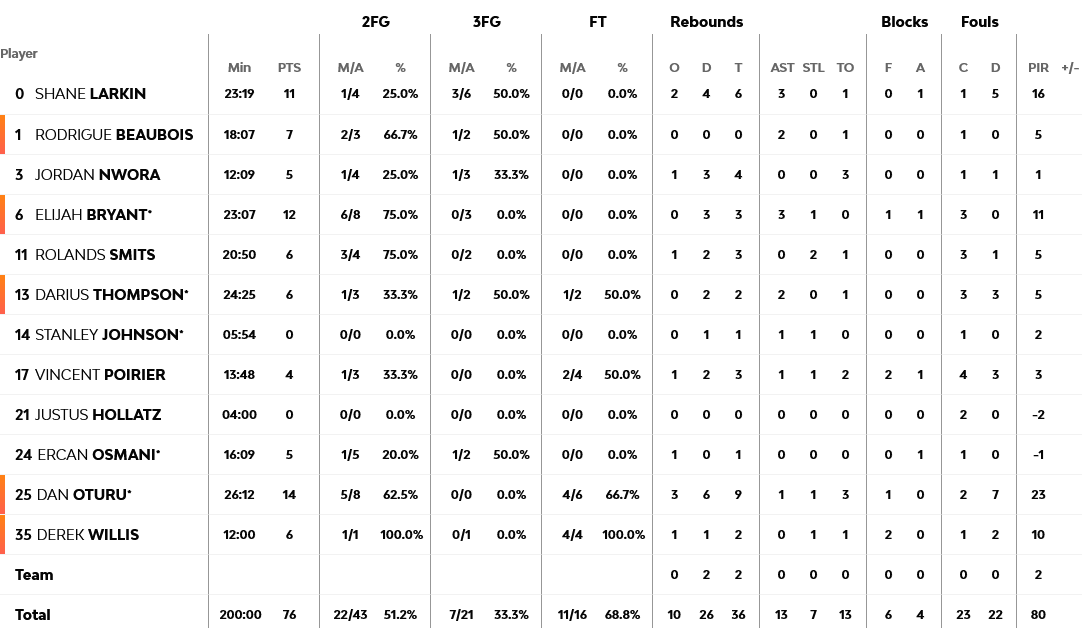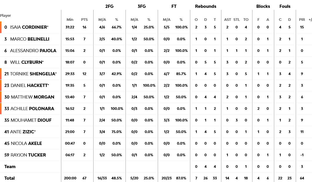 14 πόντοι και εννέα ριμπάουντ ήταν ο απολογισμός του Οτούρου, με τον Λάρκιν να έχει 11 πόντους και τον Μπράιαντ 12. Για την Βίρτους, Κορντινιέ και Σενγκέλια είχαν 16 και 12 πόντους αντίστοιχα.