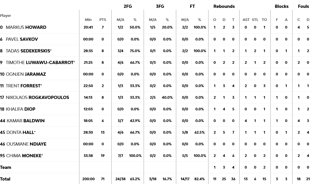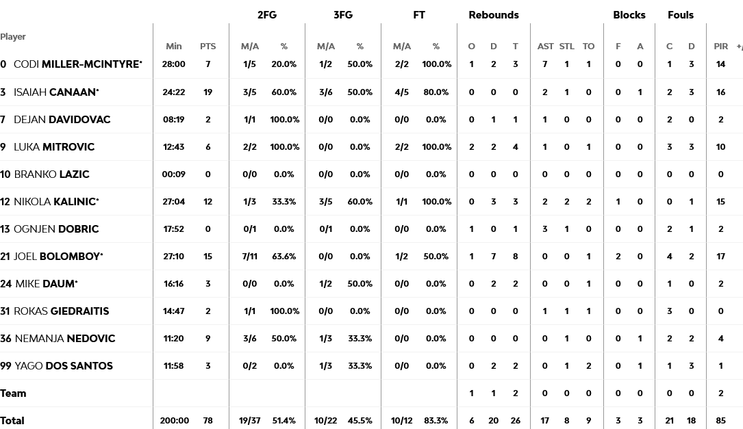 Από τους Σέρβους ξεχώρισαν οι Κάναν με 19 πόντους και 2 ασσίστ και Μπολομπόι με 15 πόντους και 8 ριμπάουντ. Από τους Βάσκους ο Μονέκε είχε 19 πόντους και 6 ριμπάουντ ενώ ο Χολ σταμάτησε στους 13.