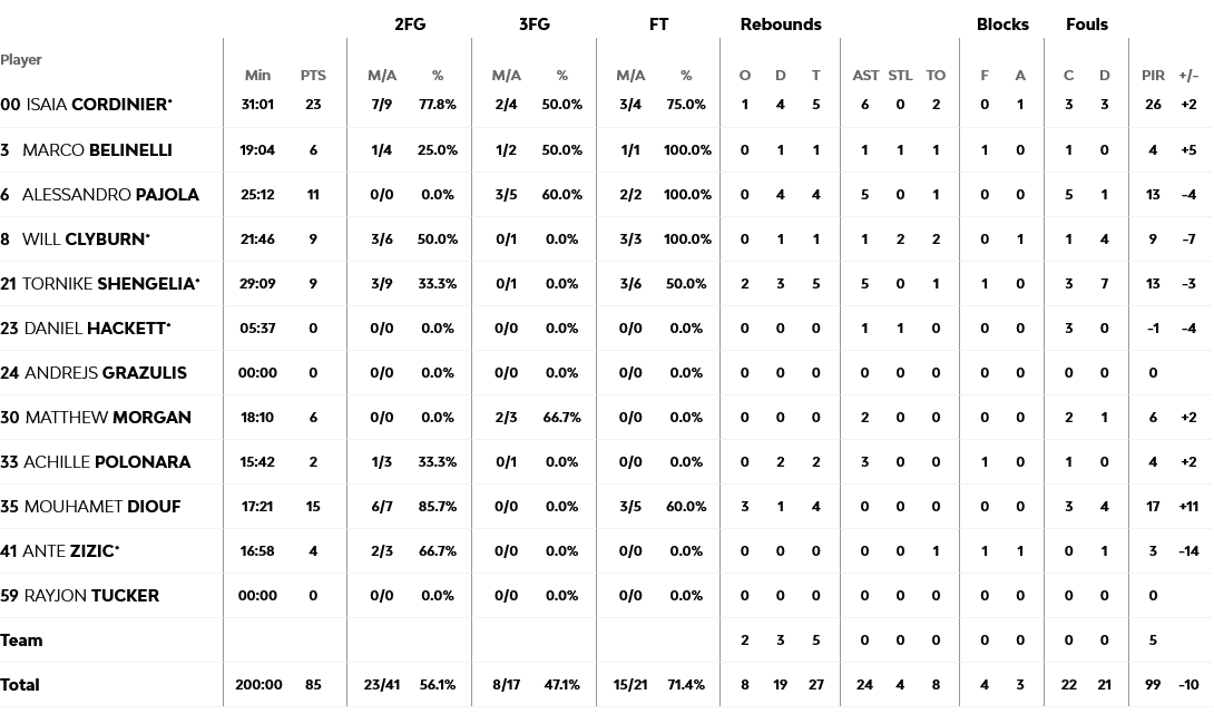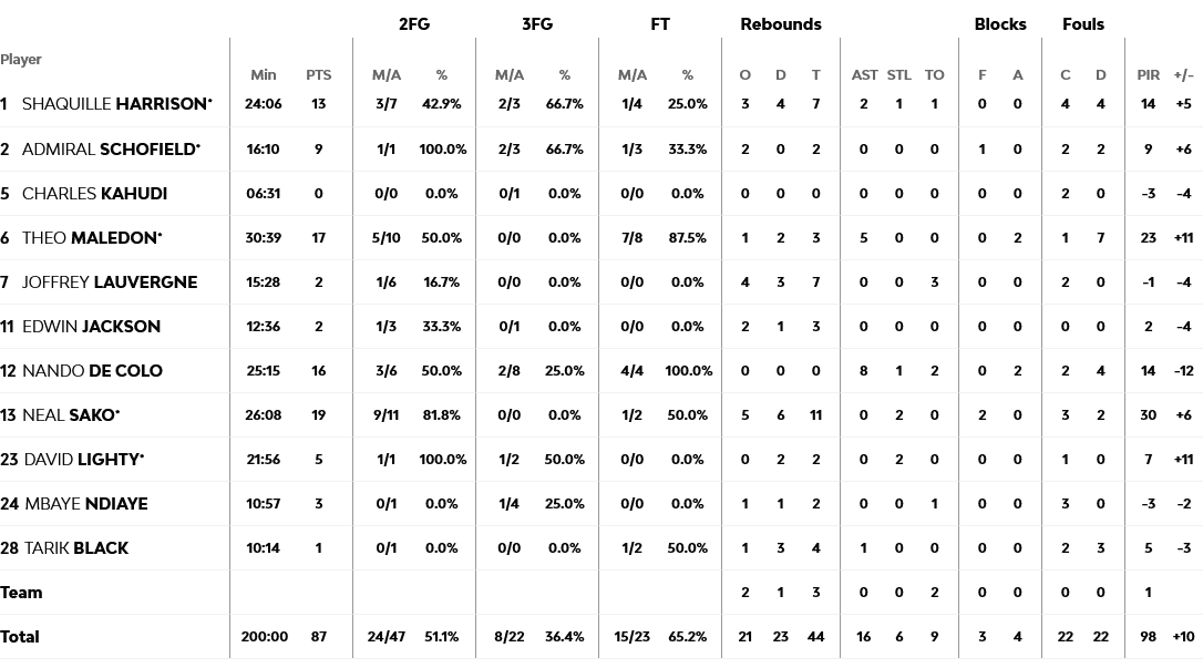 Για τους Γάλλους ξεχώρισε ο Σάκο με 19 πόντους και 11 ριμπάουντ και ακολούθησε ο Μαλεντόν με 17 και ο Ντε Κολό με 16 πόντους και 8 ασσίστ. Για την Βίρτους ο εξαιρετικός ήταν ο Κορντινιέ με 23 πόντους, 5 ριμπάουντ και 6 ασσίστ και ακολούθησε ο Ντιουφ με 15 πόντους.