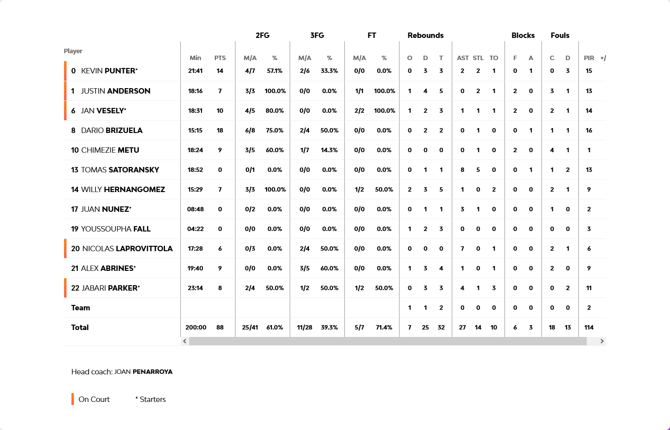 Οι Καταλανοί μπήκαν πολύ δυναμικά στο ματς, ξεκινώντας με επί μέρους σκορ 8-0 στα πρώτα 2 λεπτά. Ωστόσο, οι φιλοξενούμενοι ανασυντάχθηκαν και μείωσαν στο καλάθι με τον Κουμάντζε (11-10) στο 6’. Μέχρι και το τέλος του δεκαλέπτου, οι δύο ομάδες έμειναν κοντά στο σκορ, με τους γηπεδούχους να κλείνουν την πρώτη περίοδο με +3, για το 19-16. Το δεύτερο δεκάλεπτο ξεκίνησε όπως και το πρώτο, με την Μπαρτσελόνα να βγάζει ενέργεια και να διατηρεί σταθερά το προβάδισμα, «χτίζοντας» τρεις φορές προβάδισμα οκτώ πόντων, με την Άλμπα να έχει απάντηση και στις τρεις προσπάθειες των Καταλανών να φύγουν, μην αφήνοντας τους γηπεδούχους να ξεφύγουν σε μη διαχειρίσιμα επίπεδα. Η ανάπαυλα βρήκε τους παίκτες του Πεναρόγια να βρίσκονται μπροστά με +6, για το 43-37 που ήταν και σκορ ημιχρόνου.