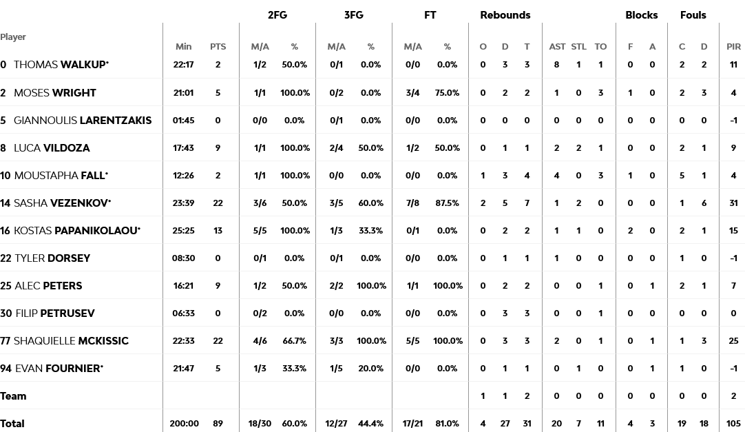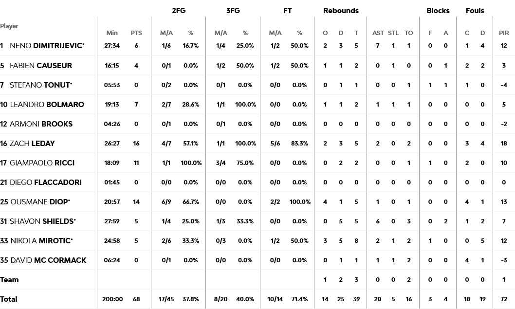 Ξεχώρισαν: Εκπληκτικός ΜακΚίσικ με 22 πόντους, ενώ ο Παπανικολάου τελείωσε το ματς με 13 πόντους. Για την Αρμάνι, ΛεΝτέι και Ντιόπ είχαν 16 και 14 πόντους αντίστοιχα.