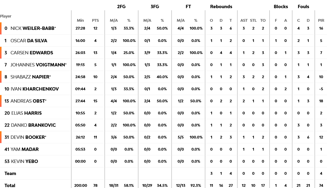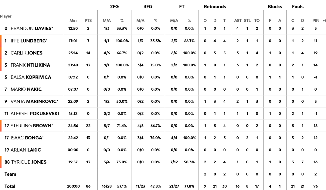 Ο Μπράουν με 22 πόντους ήταν ο πρώτος σκόρερ των νικητών, με τον Κάρλικ Τζόουνς να έχει 14, ενώ για την Μπάγερν Μονάχου, ο Ομπστ είχε 15 πόντους και ο Κάρσεν Έντουαρντς 13.