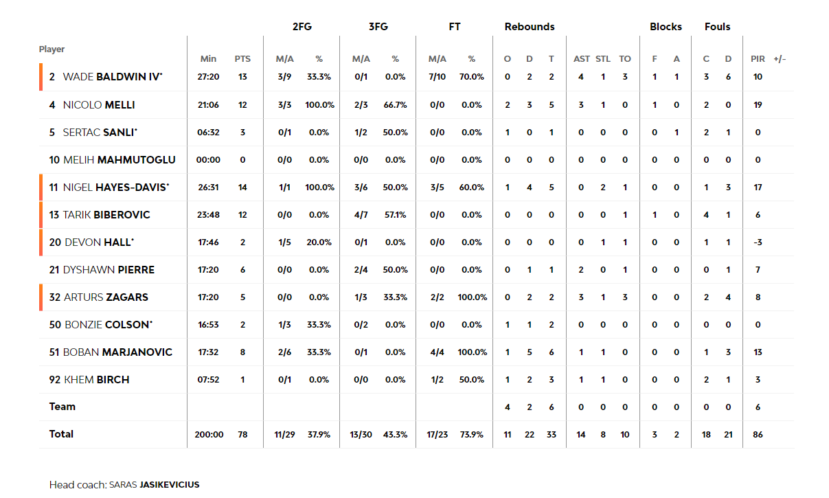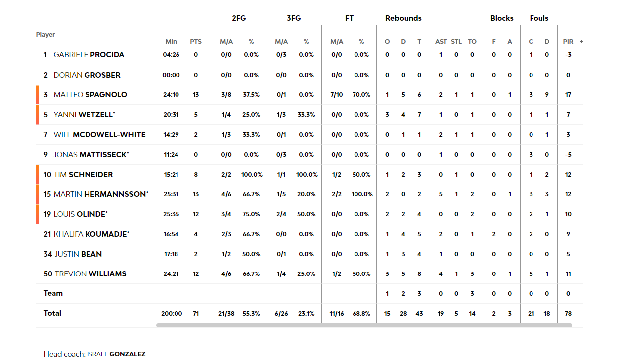 Διακριθέντες για τους φιλοξενούμενους ήταν ο Μπάλντγουιν με 13 πόντους και 4 ασσίστ και ο Μέλλι με 12 πόντους και 5 ριμπάουντ. Από πλευράς Άλμπα, σε καλή μέρα ήταν ο Χέρμανσον με 13 πόντους και 5 ασσίστ και ο Γουίλιαμς με 12 πόντους και 8 ριμπάουντ.