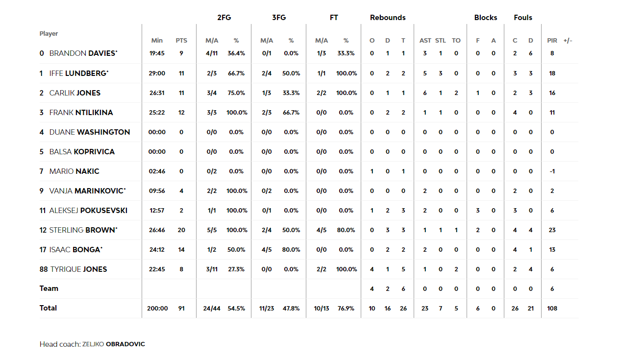Η ομάδα του Ζέλικο Ομπράντοβιτς ήταν καταιγιστική στο δεύτερο ημίχρονο και έφτασε στην πρώτη φετινή νίκης της εκτός έδρας στην διοργάνωση με σκορ 79-91. Οι γηπεδούχοι "κόλλησαν" επιθετικά στο τελευταίο τρίλεπτο και γνώρισαν την δεύτερη ήττα τους. Σε μεγάλο βράδυ ο Στέρλινγκ Μπράουν με 20 πόντους.