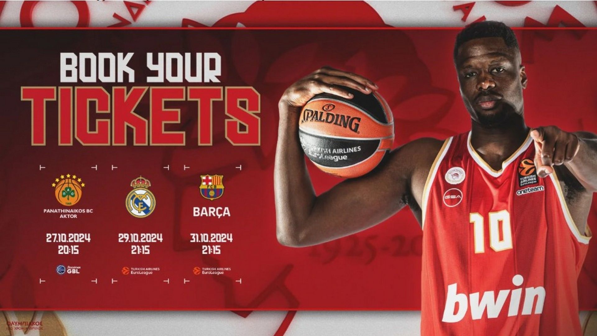 Η Κ.Α.Ε. ΟΛΥΜΠΙΑΚΟΣ ανακοινώνει ότι για τον αγώνα Ελληνικού Πρωταθλήματος Stoiximan Basket League 2024 - 2025 με τον ΠΑΝΑΘΗΝΑΪΚΟ AKTOR 27/10/2024, με ώρα έναρξης 20:15 και για τους αγώνες Euroleague με την REAL MADRID 29/10/2024, με ώρα έναρξης 21:15 και με την FC BARCELONA 31/10/2024, με ώρα έναρξης 21:15 η διάθεση των εισιτηρίων πραγματοποιείται ως εξής: