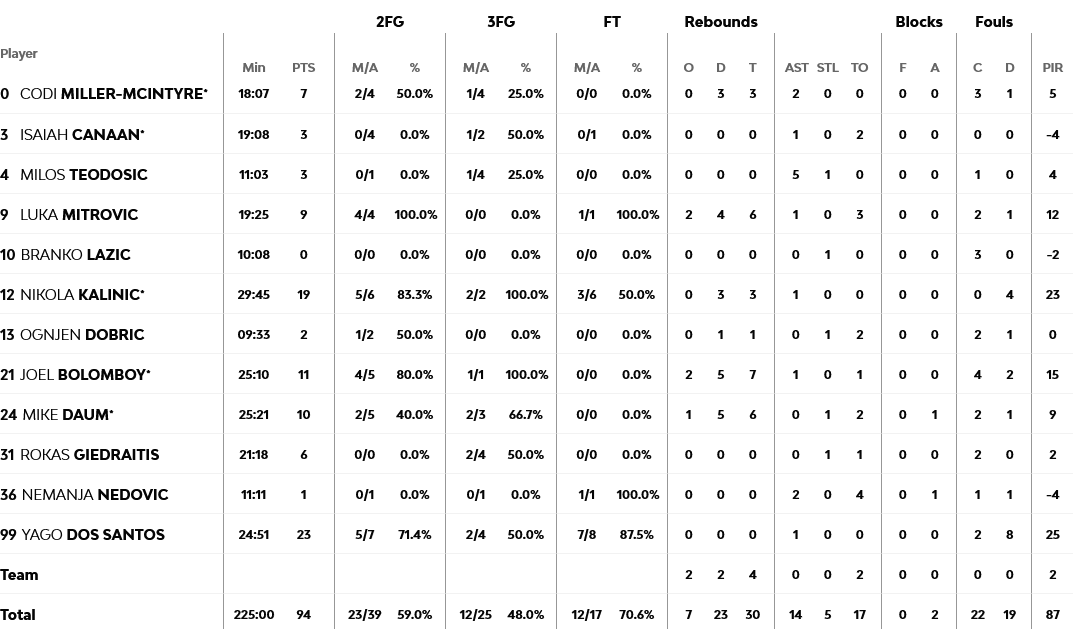 Τα δεκάλεπτα: 25-26, 47-44, 66-63, 84-84 (κ.δ) 94-98 (παρ)