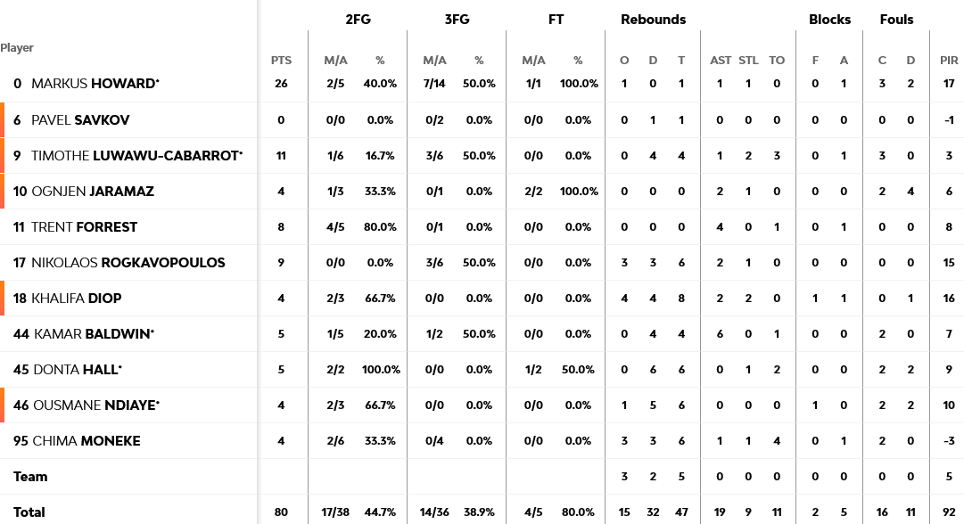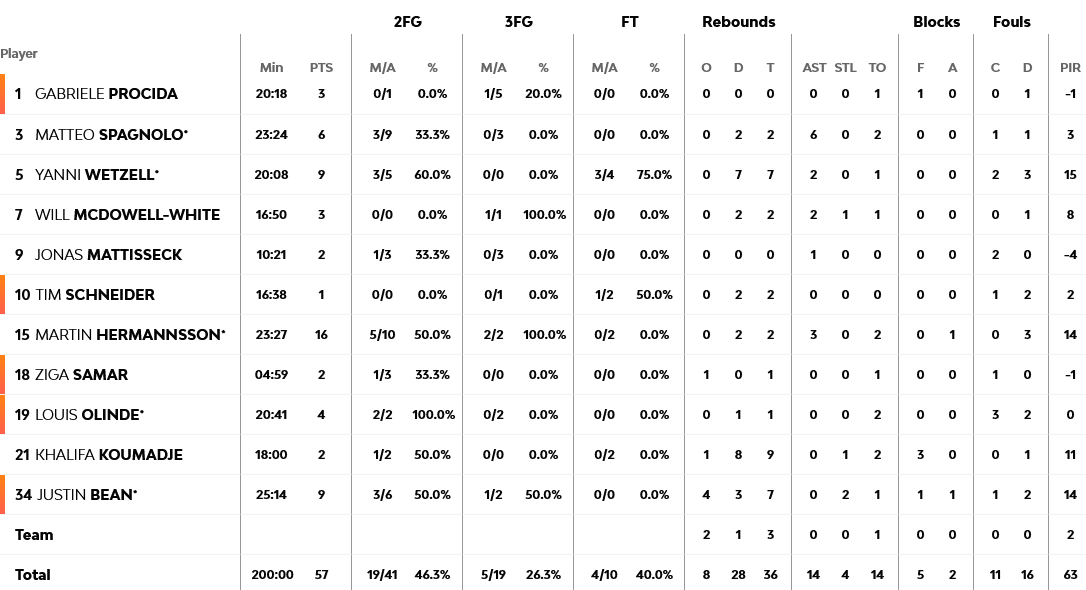 Εξαιρετική εμφάνιση από τον Μάρκους Χάουαρντ, που τελείωσε το ματς με 26 πόντους, με τον Λουβαβού Καμπαρό να ακολουθεί με 11. Για την Άλμπα, ο Χέρμανσον είχε 16 πόντους.