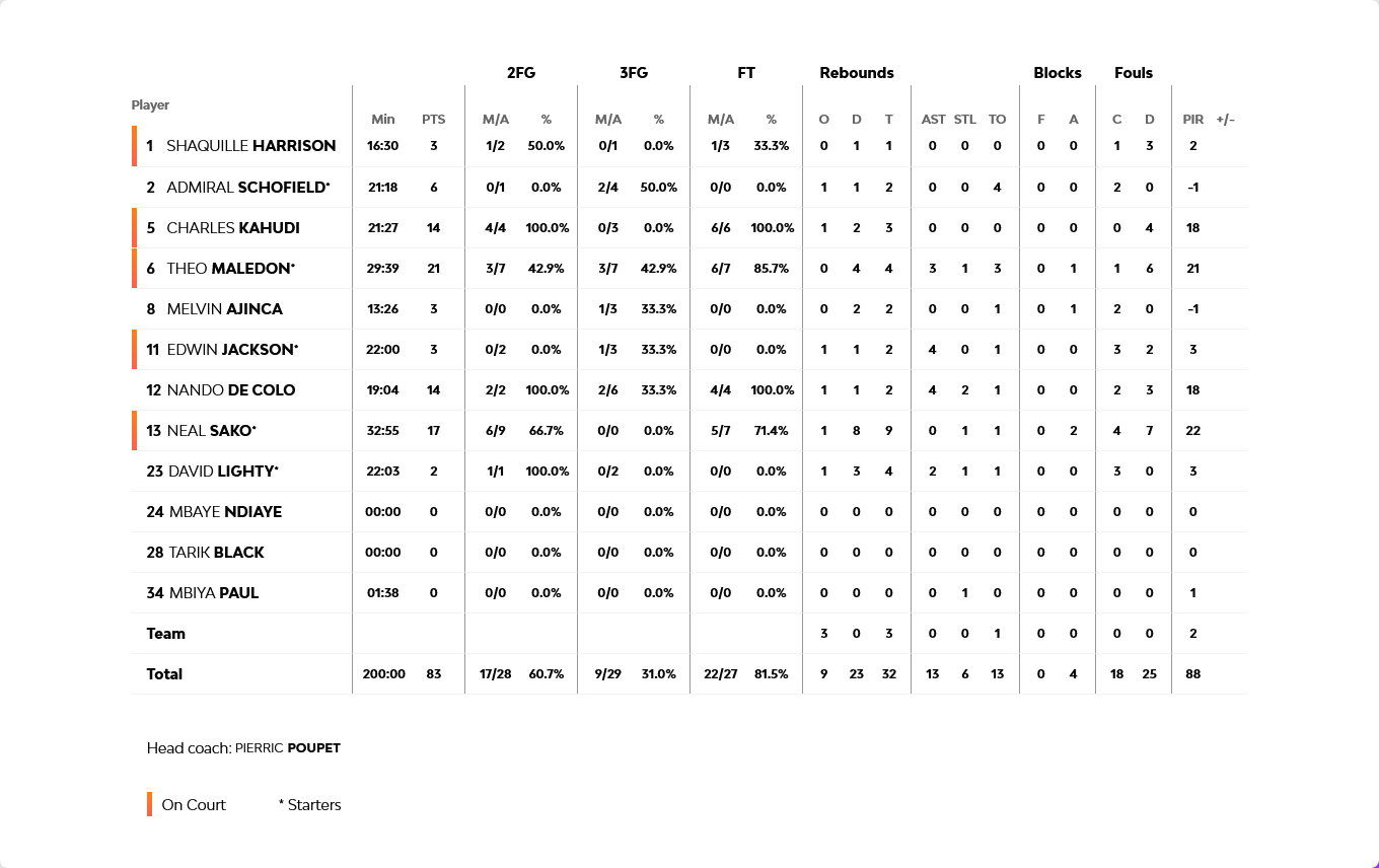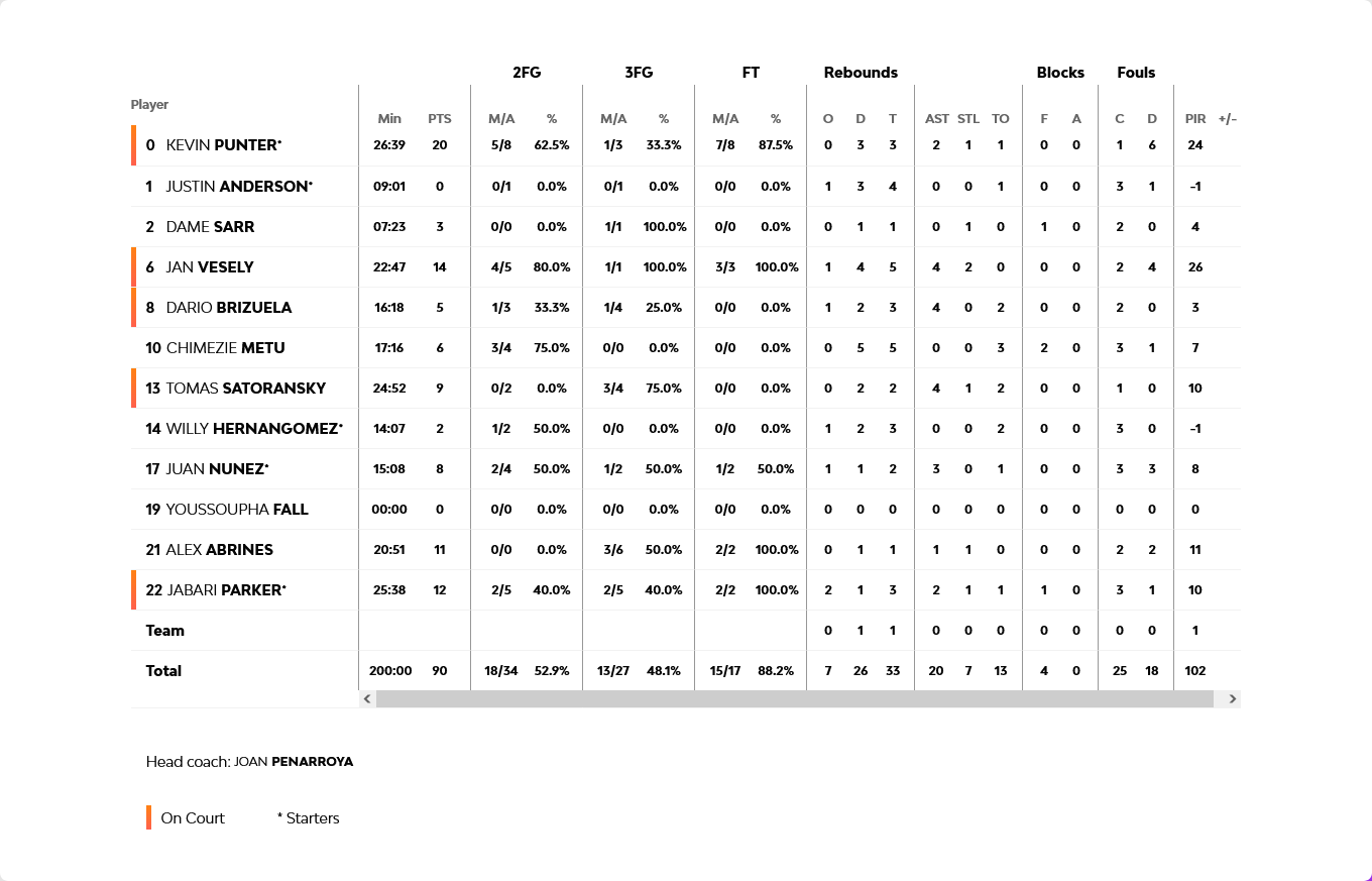 Ο Κέβιν Πάντερ με 20 πόντους ήταν το πρώτο... βιολί των νικητών, με τον Βέσελι να ακολουθεί με 14, ενώ για την Βιλερμπάν, ο Μαλεν τόν είχε 21 πόντους και οι Καουντι και Ντε Κολό από 14 έκαστος.