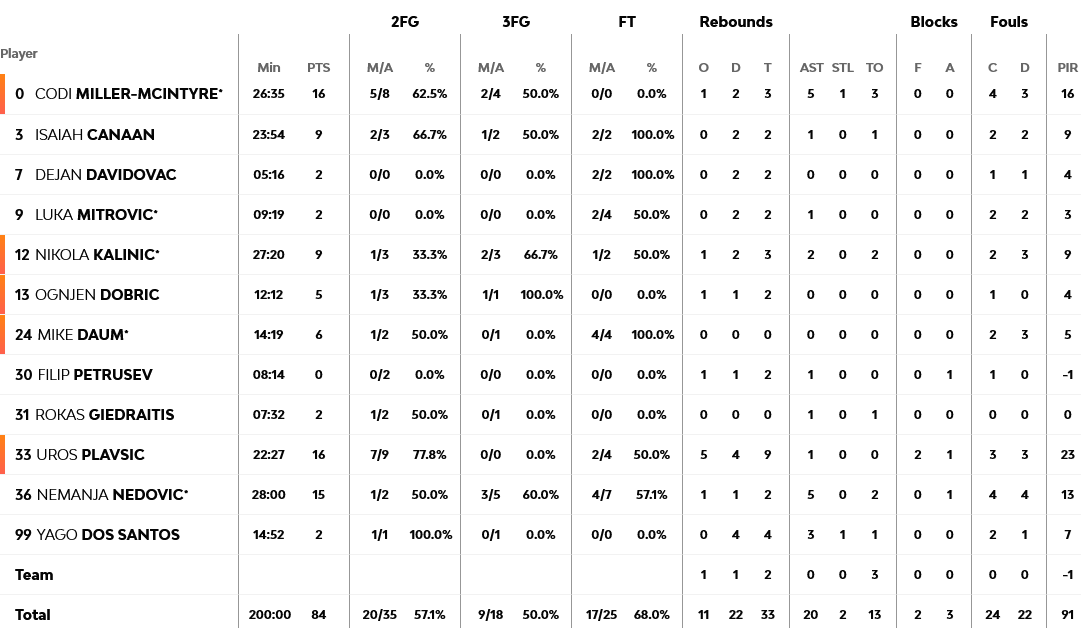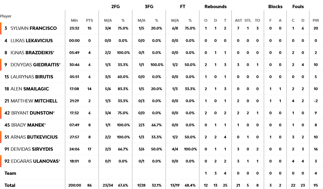 Ο Σιρβίντις με 17 πόντους ήταν ο πρώτος σκόρερ της Ζαλγκίρις, με τον Φρανσίσκο να ακολουθεί με 16 και τον Σμάιλαγκιτς με 14. Για τον Ερυθρό Αστέρα, από 16 πόντους είχαν οι Πλάβτσιτς και Μίλερ – Μάκινταϊρ.