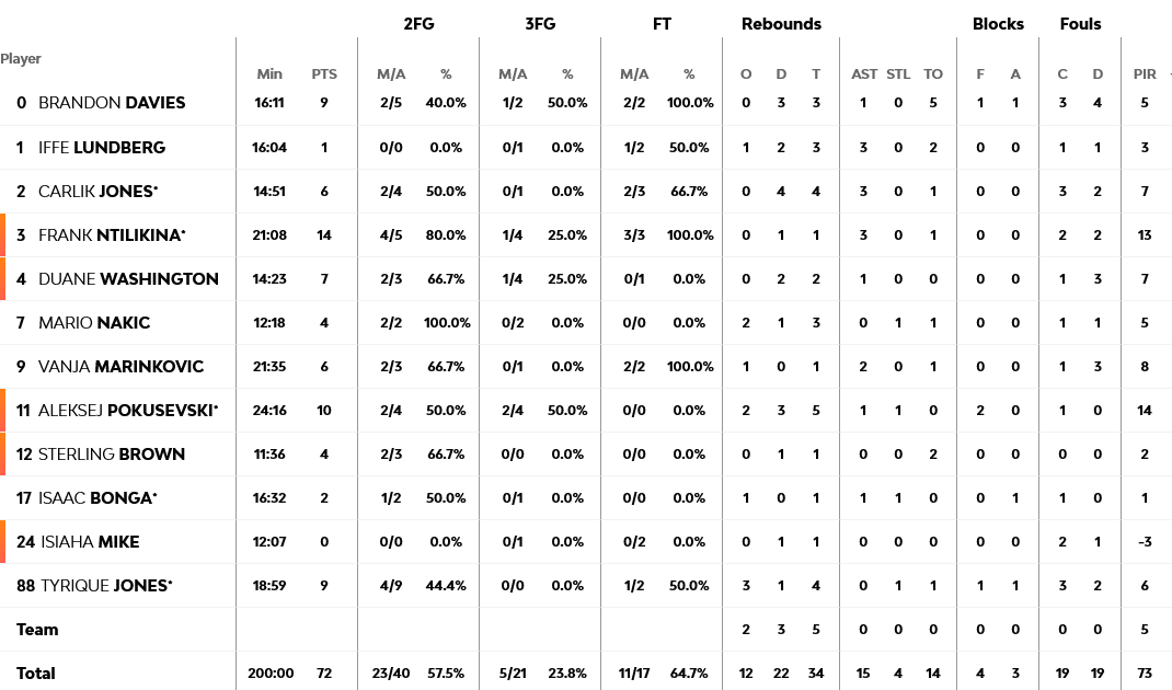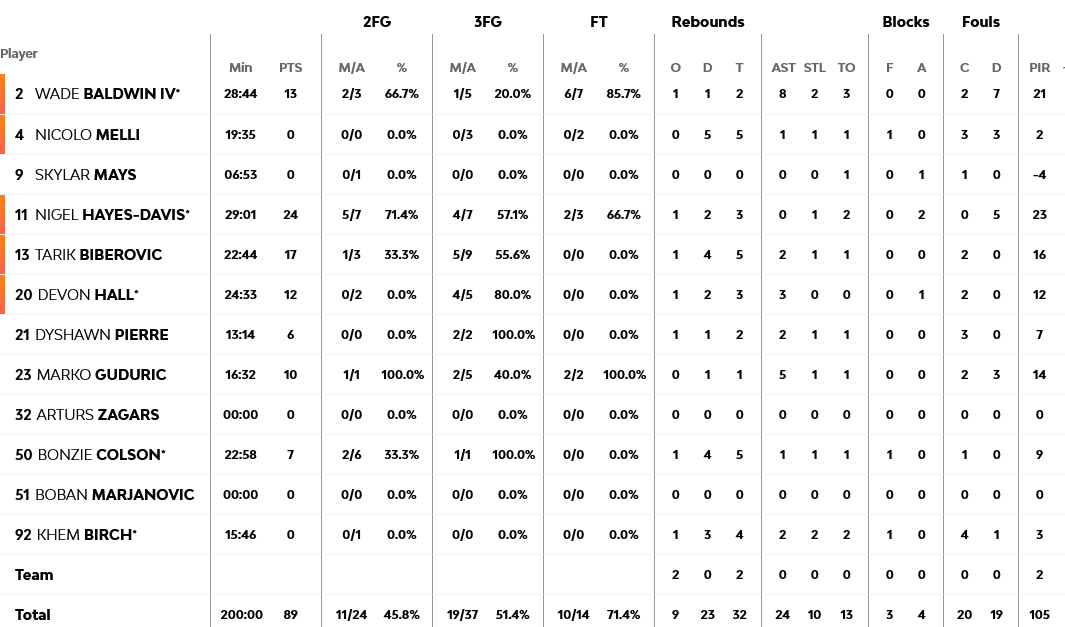 Εξαιρετικοί οι Χέιζ Ντέιβις με 24 πόντους και 4/7 τρίποντα και Ταρίκ Μπιμπέροβιτς με 17 πόντους και 5/9 τρίποντα, με τον Μπάλντγουιν να προσθέτει 13 πόντους και οκτώ ασίστ. Από το… ναυάγιο της Παρτιζάν, διασώθηκε ο Ντιλικινά με 14 πόντους και ο Ποκουσέβσκι με 10.