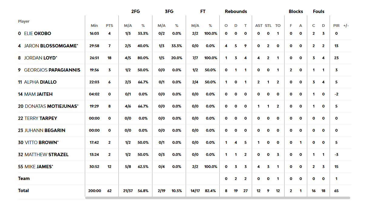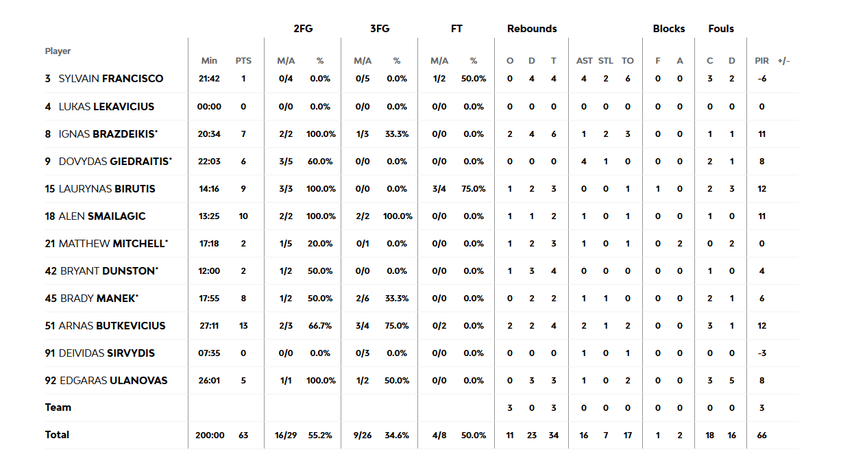 Κορυφαίοι για τους γηπεδούχους οι Μπουτκέβιτσους και Σμάιλαγκιτς με 13 και 10 πόντους αντίστοιχα. Για τους φιλοξενούμενους ξεχώρισε ο Λόιντ με 18 πόντους και 4 ασσίστ και ο Μπλοσομγκέιμ με 7 πόντους και 9 ριμπάουντ