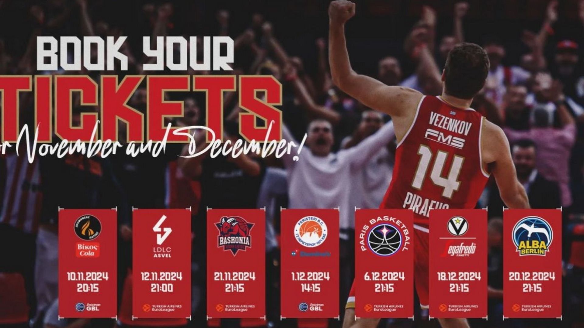Ούτε ένα, ούτε δύο, αλλά επτά εντός έδρας παιχνίδια καλείται να δώσει ο Ολυμπιακός το δίμηνο Νοέμβριος – Δεκέμβριος, σε Basket League και Euroleague.
