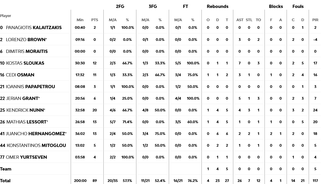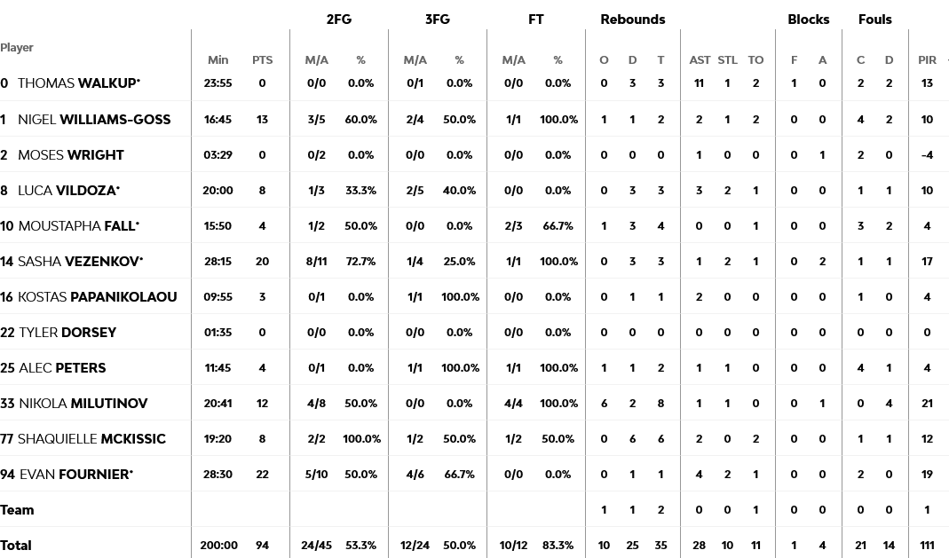 Ξεχώρισαν: 20 πόντους πέτυχε ο Σάσα Βεζένκοβ, με τον Γκος να προσθέτει 13 πόντους και τον Μιλουτίνοβ να έχει 12 πόντους και οκτώ ριμπάουντ. Για τον Παναθηναϊκό, 20 πόντους είχε ο Ναν και από 13 οι Λεσόρ και Ερνανγκόμεθ, έχοντας και πέντε με έξι ριμπάουντ αντίστοιχα.