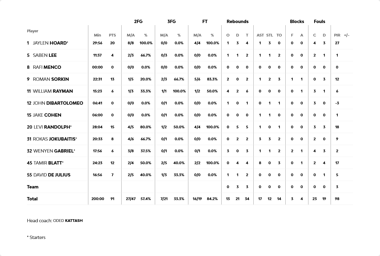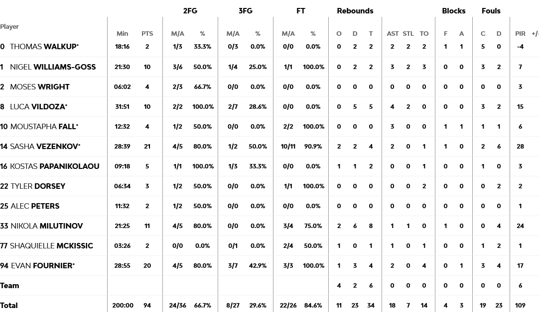 Ξεχώρισαν: Για ακόμα ένα ματς ο Βεζένκοβ ξεπέρασε τους 20 πόντους (21), με τον Μιλουτίνοβ να έχει 11 πόντους και οκτώ ριμπάουντ, ενώ συγκλονιστικός (κυρίως στην άμυνα) ήταν ο Βιλντόσα, με 10 πόντους, πέντε ριμπάουντ, τέσσερις ασίστ και δύο κλεψίματα. Για την Μακάμπι, εμφάνιση καριέρας έκανε ο Χόαρντ με 20 πόντους, με τον Ράντολφ να έχει 15, τον Σόρκιν 13 και τον Μπλατ 12 πόντους, τέσσερα ριμπάουντ και οκτώ ασίστ.
