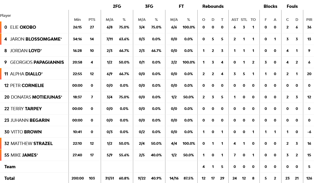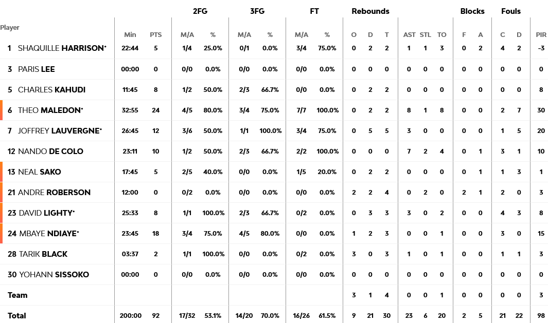 Για τους Μονεγάσκους καταπληκτικός ήταν ο Οκόμπο με 27 πόντους και 6 ασσίστ και ακολούθησε ο Τζέιμς με 17 πόντους και 7 ασσίστ. Για τους φιλοξενούμενους ο Μαλεντόν ήταν φοβερός με 24 πόντους και 8 ασσίστ και ακολούθησε με 18 ο Εντιαγιέ.