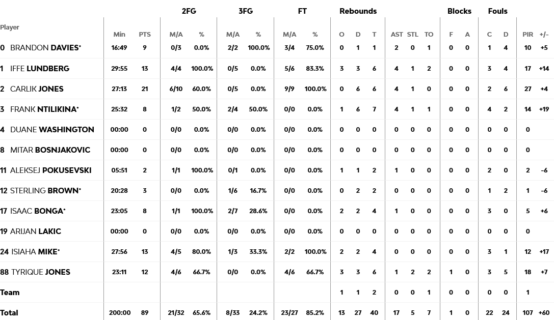 Για τους νικητές ξεχώρισε ο Κάρλικ Τζόουνς με 21 πόντους και 6 ριμπάουντ και ακολούθησε ο Λούντμπεργκ με 13 πόντους και 6 ριμπάουντ. Για τους ερυθρόλευκους εξαιρετικός αλλά μόνος ήταν ο Πετρούσεβ με 20 πόντους και 8 ριμπάουντ.