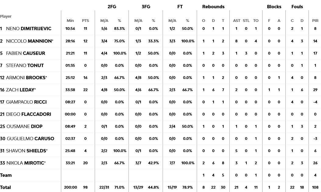 22 πόντοι και επτά ριμπάουντ ήταν ο απολογισμός του Ζακ ΛεΝτέι, με τον Νίκολα Μίροτιτς να έχει 20 πόντους και οκτώ ριμπάουντ, ενώ 16 πόντους πρόσθεσε ο Μπρουκς. Για την Μακάμπι, 20 πόντους σημείωσε ο Χόαρντ.