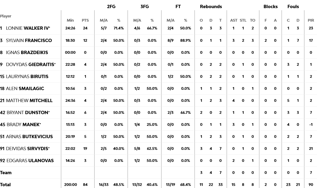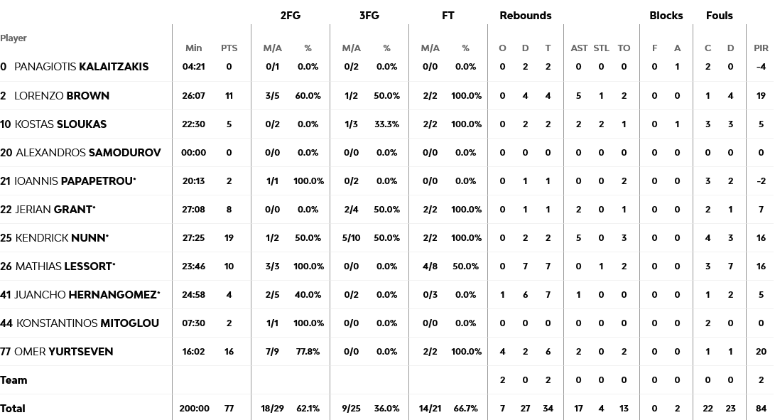 Ξεχώρισαν: «Καυτός» Σιρβίντις με 19 πόντους και 5/8 τρίποντα, ενώ ο Φρανσίσκο είχε 12 πόντους. Για τον Παναθηναϊκό, ο Ναν είχε 19 πόντους και ο Γιούρτσεβεν 16.